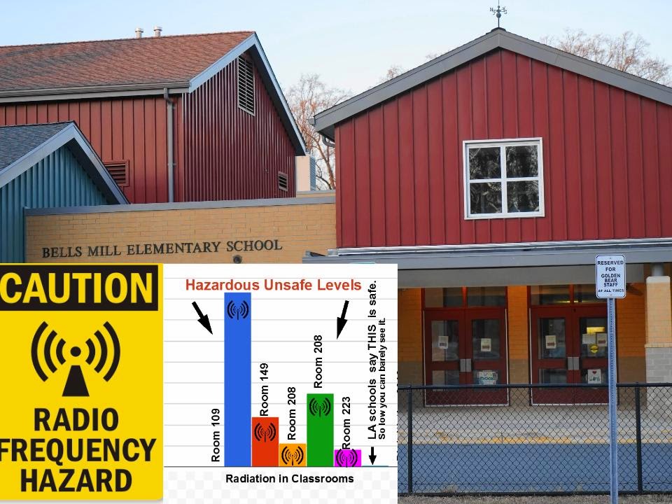 WiFi Radiation levels were measured at several rooms in Bells Mill Elementary by Montgomery County School Staff. The radiation measurements show: